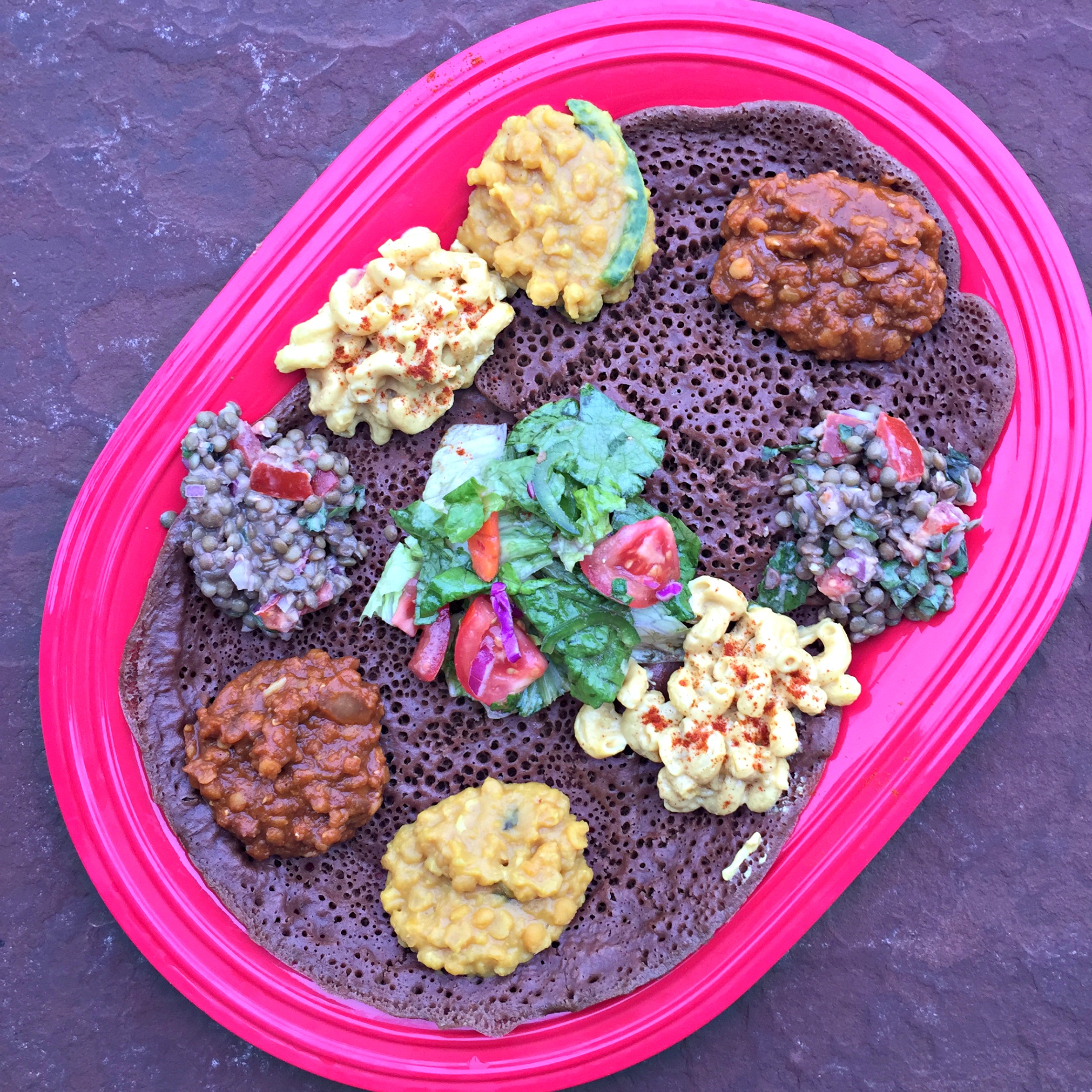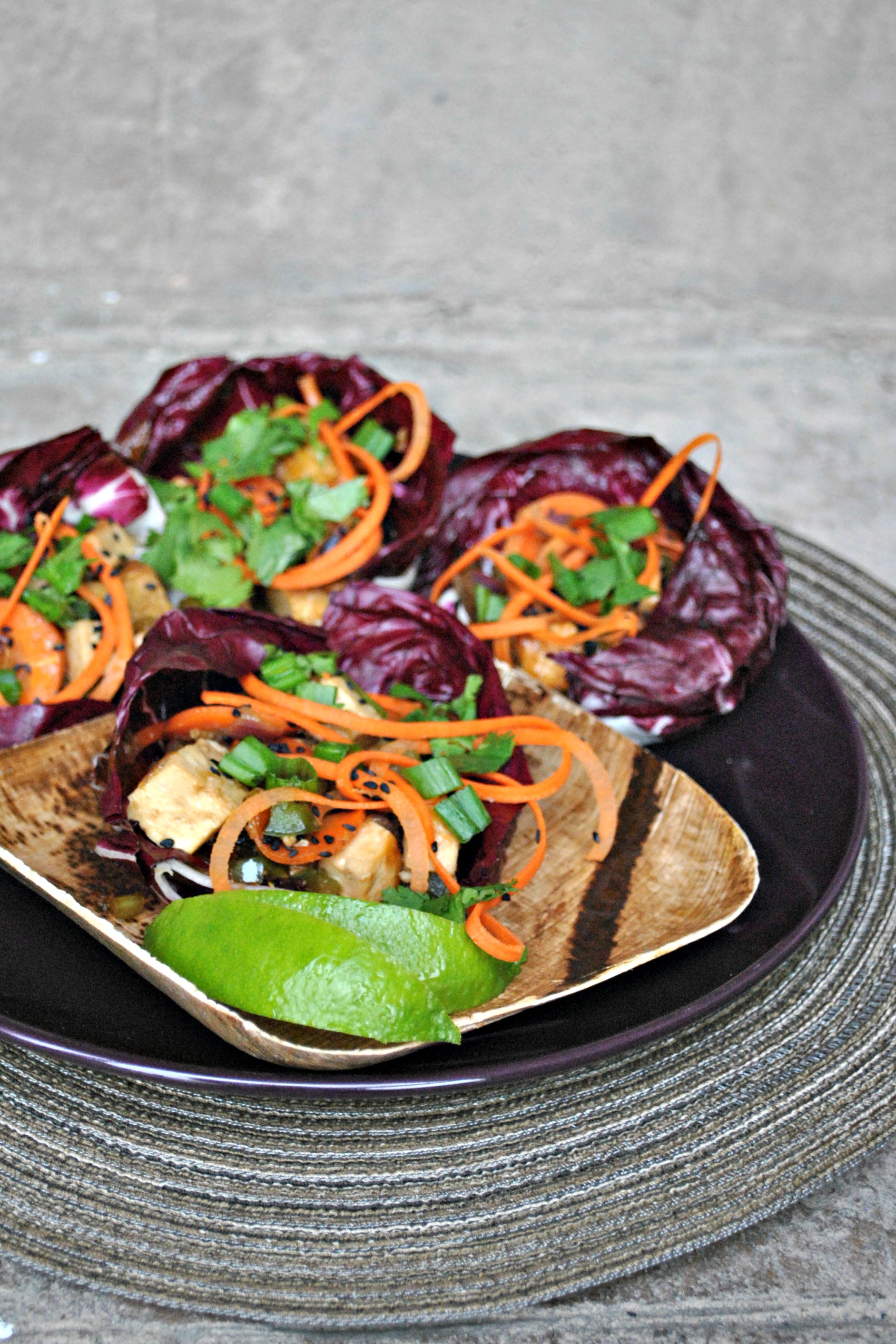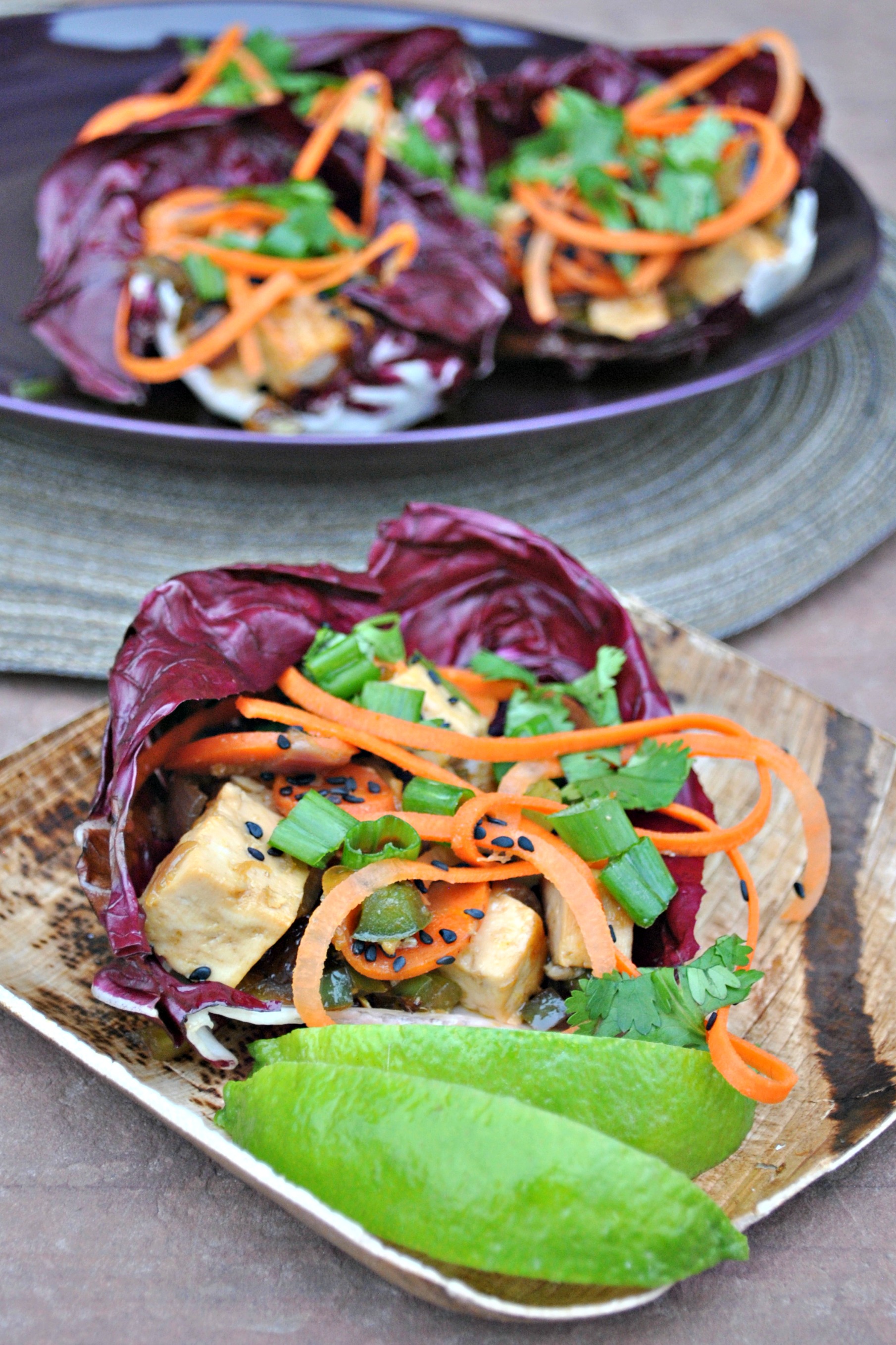 Now for one of my very favorite recipes I tested from Vegan Without Borders. This salad is so incredible. Make it during your Holiday preparations (or any time) as a light and refreshing main dish or as a beautifully presented side dish. Robin’s recipe calls for arugula, which I couldn’t get locally, so I put the salad in red cabbage leaves. I think that’s the second best choice.