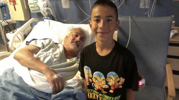 George in the Hospital following his Heart Attack with his son Caine of Caine’s Arcade Fame