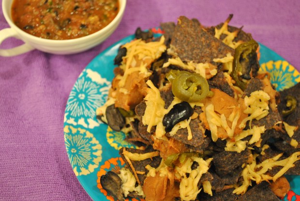 To make nachos, preheat oven to 450 degrees, layer tortilla chips (we like red hot blues), vegan refried beans, sliced olives, jalapenos and a couple of rounds of grated pepper jack cashew cheese on a baking sheet. Heat for 5-10 minutes or until all hot, melty and bubbly. Serve with sriracha and olive salsa fresca.